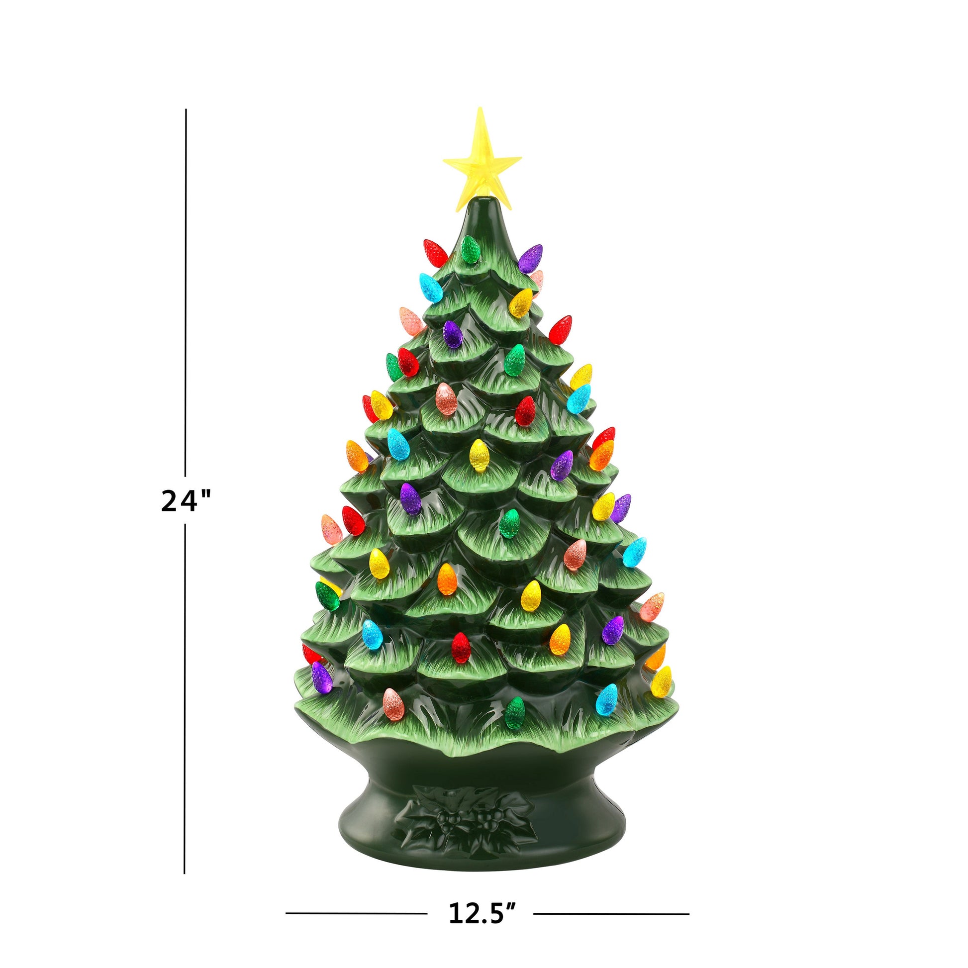 Bring the vintage charm home with this 24" Nostalgic Tree by Mr. Christmas. Inspired by the trees of decades past but brought into the present with new technology. LED light glows through the faceted bulbs, and a bright yellow star illuminates the top of this oversized tree with a polished green finish. Operates on an included AC adapter with on/off switch. This tree looks great on the mantel, side table, bedroom, bookshelf, or anywhere that needs a festive touch. The Mr. Christmas Nostalgic Christmas Tree makes the perfect gift for your loved ones or yourself.